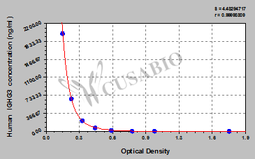 通過線性范圍來計算出實際的檢測樣本值,定量試劑盒標準曲線的相關系數R大于0.99。以CSB-E07270h(人脂聯素(ADP)ELISA Kit)為例的標準曲線。