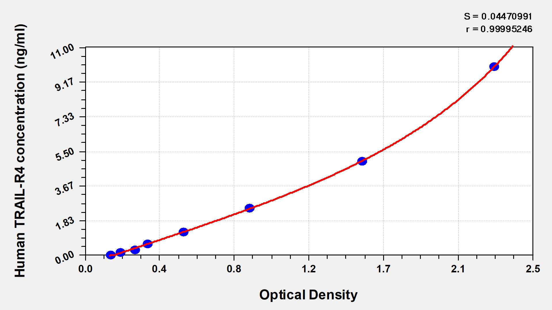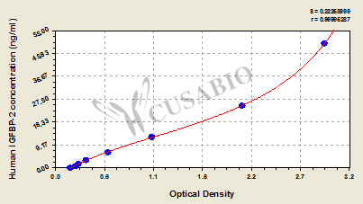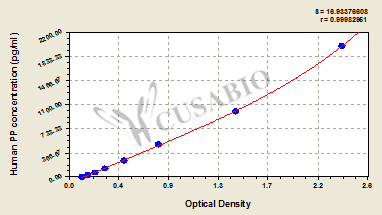 通過(guò)線性范圍來(lái)計(jì)算出實(shí)際的檢測(cè)樣本值,定量試劑盒標(biāo)準(zhǔn)曲線的相關(guān)系數(shù)R大于0.99。以CSB-E07270h(人脂聯(lián)素(ADP)ELISA Kit)為例的標(biāo)準(zhǔn)曲線。