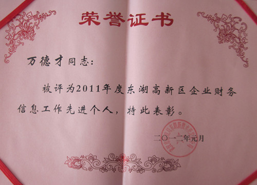 熱烈祝賀財(cái)務(wù)部萬(wàn)德才同志獲評(píng)2011年度東湖高新區(qū)企業(yè)財(cái)務(wù)信息工作先進(jìn)個(gè)人