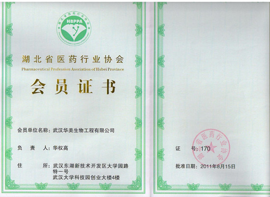 2011年8月15日,武漢華美生物工程有限公司正式成為湖北省醫(yī)藥行業(yè)協(xié)會(huì)會(huì)員。 湖北省醫(yī)藥行業(yè)協(xié)會(huì)于2005年6月由湖北省醫(yī)藥行業(yè)十余家企業(yè)聯(lián)合倡議發(fā)起組織,于2005年8月4日經(jīng)湖北省民政廳批準(zhǔn)正式成立。它是適應(yīng)...