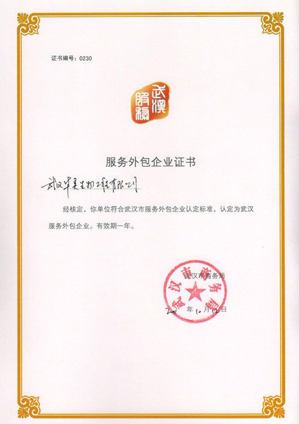 武漢華美生物工程有限公司被認(rèn)定為武漢市服務(wù)外包企業(yè)