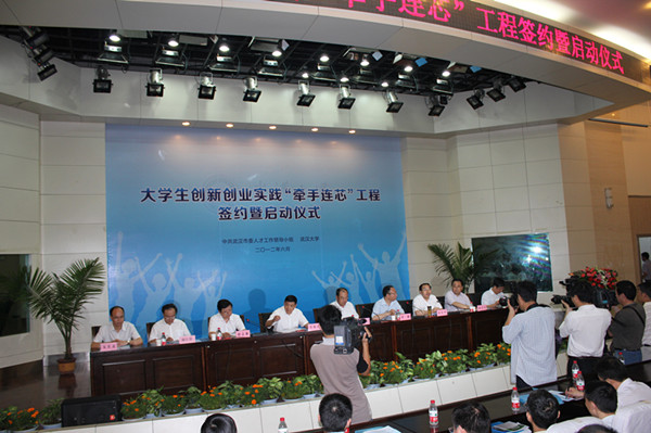 2012年6月20日上午,大學(xué)生創(chuàng)新創(chuàng)業(yè)實(shí)踐“牽手連芯”工程簽約暨啟動(dòng)儀式在武漢大學(xué)化學(xué)與分子科學(xué)學(xué)院創(chuàng)隆廳隆重舉行。省委常委、市委書記、市人大常委會(huì)主任阮成發(fā),市長(zhǎng)唐良智,武漢大學(xué)黨委書記李健、校長(zhǎng)李曉...