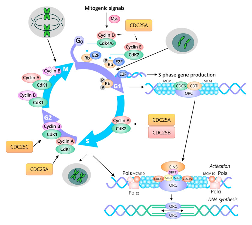 細(xì)胞周期標(biāo)記物負(fù)責(zé)調(diào)控和維持真核細(xì)胞的細(xì)胞周期。它們包括E2F轉(zhuǎn)錄因子、細(xì)胞周期素依賴性激酶(CDKs)、細(xì)胞周期素、微染色體維持(MCM)蛋白、增殖細(xì)胞核抗原(PCNA)、細(xì)胞分裂周期25(Cdc25)蛋白和Geminin。Cyclin D-Cdk4/Cdk6在G1早期調(diào)控事件;cyclin E-Cdk2觸發(fā)S期;MCM蛋白對(duì)啟動(dòng)DNA復(fù)制至關(guān)重要;cyclin A-Cdk2和cyclin A-Cdk1調(diào)節(jié)S期的完成;所有三個(gè)Cdc25蛋白在有絲分裂期間發(fā)揮作用;Cdk1-cyclin B負(fù)責(zé)有絲分裂。