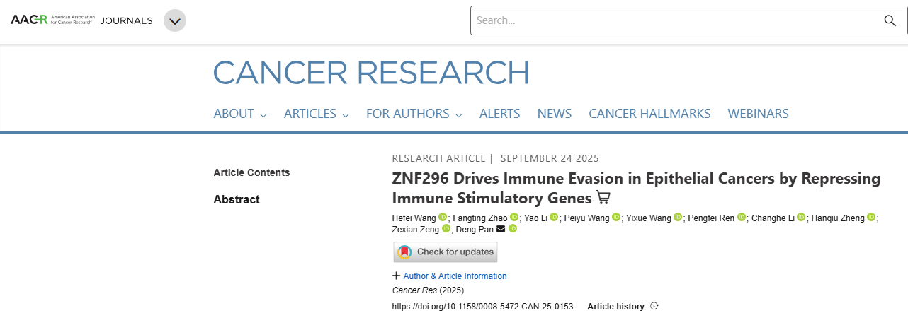 [3]ZNF296 Drives Immune Evasion in Epithelial Cancers by Repressing Immune Stimulatory Genes.Cancer Res,2025 Sep 24